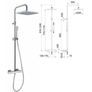 Miscelatore termostatico doccia esterno con colonna telescopica, soffione quadro ABS 200x200 mm e doccetta monogetto